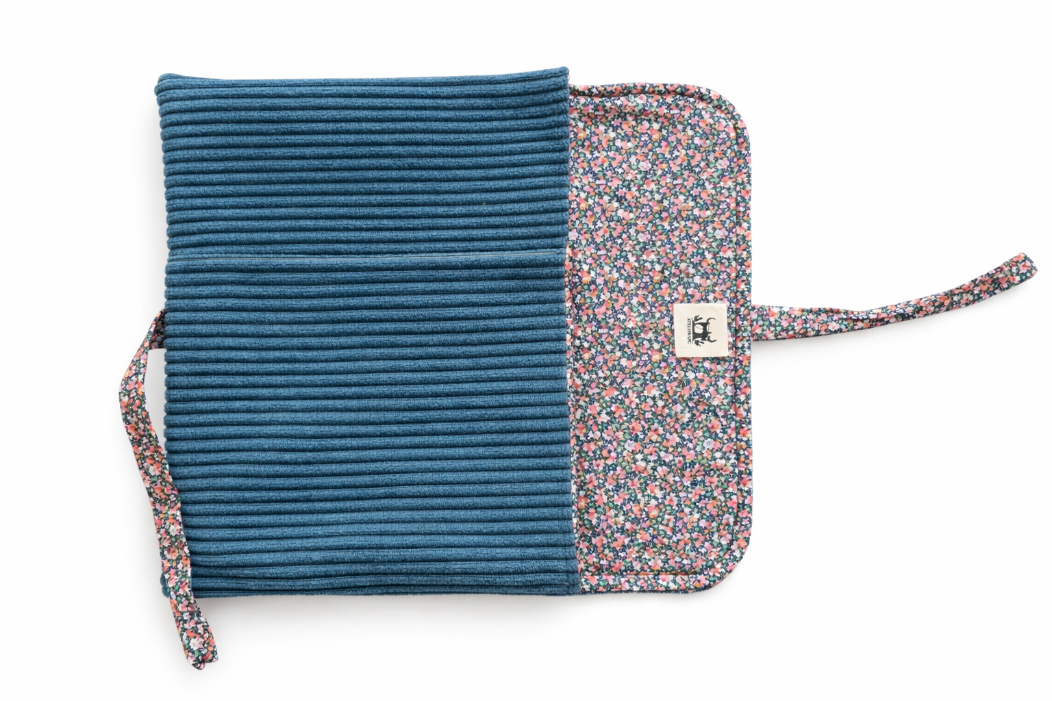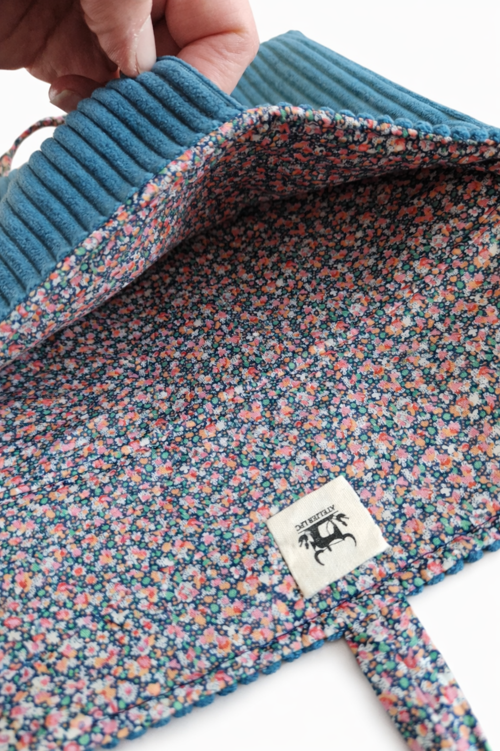 Confectionnée en velours côtelé, elle offre une texture douce et chaleureuse. L’intérieur en coton Liberty fleuri apporte une note délicate et raffinée.